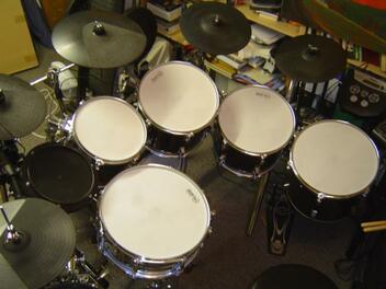 Unter den Meshheads habe ich mich dann für das Drumtec Diablo set entschieden, wobei ich anfangs nur ne Bassdrum, die VH11 und ein Snarepad mit Ständer hatte. Über weihnachten gab es dann noch 2 Becken und 2 Toms dazu. In naher Zukunft möchte ich mir noch ein 3. Beckenpad anschaffen. Irgendwann in ferner Zukunft werde ich dann noch die 12" snare gegen eine 13" Diamond snare oder ne 14" Sapeli tauschen und so zu einem 3. Tom kommen.