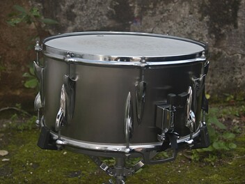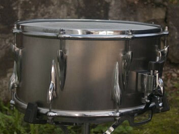 hier ist noch eine Snare, die ich vor einiger Zeit gemacht habe. Den satinierten 4mm starken 14x7,5'' Kessel habe ich aus einem Reststück Edelstahlrohr (V2A) gemacht. Die Hardware ist von Premier: die bekannten low profile Gußreifen und Böckchen von einer alten Standtom aus den späten 60er oder frühen 70er (die Serien nach Olympic und Royal Ace). Die Engländer haben solche Böckchen nur an Floortoms genutzt; ich finde, die sehen an tiefen Snares echt stylisch aus. Der Strainer ist von einer Cabria Snare und entspricht bis auf das Logo der Abhebung, die bei ST Drums "555" heißt - schlicht aber gut funktionierend und haltbar.