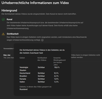 Seit 2022 fällt mir vermehrt auf, dass die Rechteinhaber einiger Songs ihre Musik in Russland (z.T. auch Belarus) sperren. So auch hier bei "Hey Joe" übrigens.