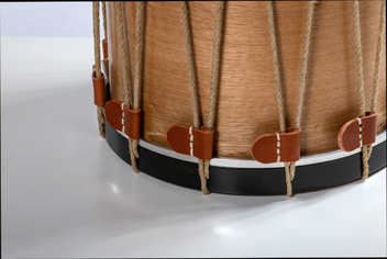Ich versuche, möglichst viel selbst zu fertigen bzw. aus der Region zu beziehen. So baue ich mittlerweile meine Kessel aus 3mm Birke mit Verstärkungsringen selbst, lasse die Lederteile regional fertigen usw. Das größte, das ich bisher gebaut habe, war ein 32"x24"- und zwei 28"x 28" Kessel. Von den beiden ist einer eine Snare geworden.