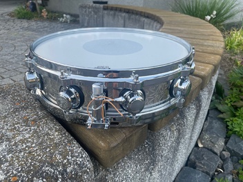 Ich hab sie dann mal spaßeshalber mit der Werksausstattung ordentlich gestimmt, das war zu meiner Überraschung ganz OK. Die Teppichansprache war so meeh, aber nen knackigen Backbeat kriegte man da raus. Also dann Remo CS Reverse Coated obendrauf, ein Encore Reso unten (die sind echt OK, die Dinger), nen Puresound mit 30 Spiralen drauf - ooooh, aaaah!!! In mittlerer Stimmung ein sehr crisper und knackiger Backbeat, ohne viel Kesselton, die Teppichansprache ist sehr gut. Dämpfung brauche ich gar keine, mag an den Gussreifen liegen. Ich habe die gestern zum ersten mal in der Bandprobe unter den Mikros getestet, sie setzt sich gut durch, auch leisere Sachen mit Ghostnotes oder leiseres Spiel mit Rods gehen prima. Die geht am Samstag mal mit zum Auftritt.