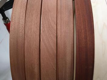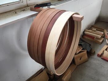 Ich habe in der letzten Zeit viele Spannreifen gebaut und dabei verschiedene Dinge probiert. Die hier zu sehenden 5 Mahagoni Reifen würde ich verschenken. Sitzen teilweise recht eng auf dem Fell, die Nähte müssen noch schön gemacht werden (kann dafür etwas Restfurnier dazu geben) und haben vielleicht hier und da ne kleine Macke.