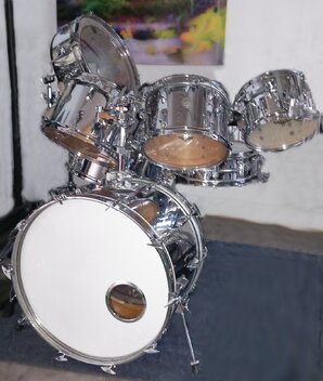Um ein einheitliches Erscheinungsbild zu erhalten, sind die 10“, 14“ und 16“er Toms sowie die Gong Bass Drum mit einer Spiegelfolie bezogen. Und weil alle Trommeln einheitlich Star Lugs und Badges haben, ist äußerlich NICHT zu erkennen, dass die zusätzlichen Trommeln aus anderen Serien stammen: es sieht alles aus „wie aus einem Guß“ (der Unterschied zwischen originaler „Silver Metallic“-Star-Folie und der Spiegelfolie ist schon aus nächster Nähe praktisch nicht mehr zu erkennen).