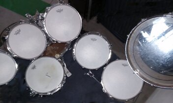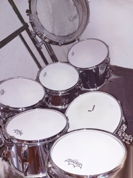 Die Schlagfelle der Toms sind Remo Emperor und wurden erst kürzlich nagelneu aufgezogen. Alle Resos (Toms): Remo Ambas in clear.