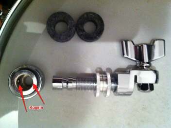 Prinzipiell ist diese Clutch fast wie alle anderen, bis eben auf das untere Teil, was hier nicht aufgedreht, sondern aufgesteckt wird. Zum Entfernen muß man es lediglich außen anfassen und nach unten abziehen, zum Aufstecken muß der Mittelteil eingedrückt werden, damit es einrasten kann. Zwei kleine Kugeln (siehe Foto, da sieht man eine der Kugeln) halten das Teil beim Spielen sicher fest. Ich find es genial einfach. Das Hi Hat Top ist so wirklich innerhalb von 1 Sekunde ausgetauscht. Super.