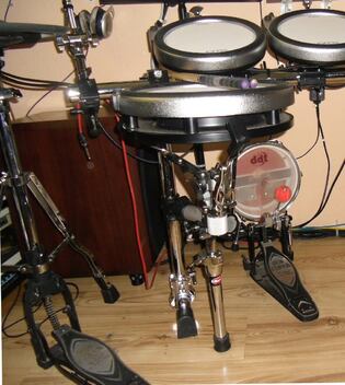 vor etwa 4 Jahren fing ich mit einem DDrum 4 an, habe aber wegen der miserablen HiHat nie richtig üben können. Jetzt habe ich vor einem Jahr ein Yamaha DTX 900 für günstige 1179 neu gekauft und auch Snare und Tom Pads, sowie passende Cymbals und HiHats dazu gekauft. Als Hardware habe ich eine Tama Iron Cobra HiHat mit 2 Beinen und eine DDT Bassdrum mit Iron Cobra Pedal. Das Pedal schraube ich fest, damit es nicht rutscht. Als Hocker habe ich mich nicht lumpen lassen und einen Tama 1st chair mit Hydralik und Rückenlehne (sehr cool nebenbei). Da ging es mir vor allem darum schnell alle Abstände zu den Fußtretern mit der passenden Sitzhöhe zu kombinieren, um die optimale Position zu finden.