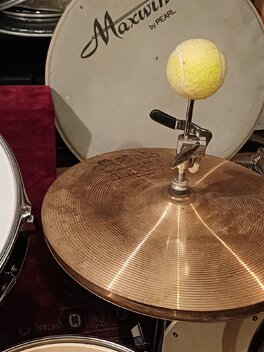 Die Hi-Hat steht rechts als Zweitgerät über einem Stand-Tom, so dass ich gut rankomme, ohne die Arme strecken zu müssen. Das Pedal möchte ich später abmontieren. Clutch mit Stick treffen schließt, und schneller Griff an den aufgesteckten Tennisball öffnet die Becken. Passt super um verschiedene Handsätze auszuprobieren und ersetzt im Moment das Ride-Becken. Ich denke inzwischen sogar, dass überkreuzte Spielweise für mich in die gleiche Schublade wie Traditional Grip gehört. Den ursprünglich angedachten Einsatzzweck für ein kleines Stand-Set habe ich noch nicht ausprobiert.